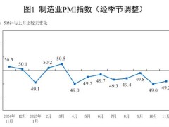 2025年11月制造业PMI环比上升0.2个百分点11月份,制造业采购经理指数(PMI)为49.2%,比上月上升0.2个百分点,景气水平有所改善。从企业规模看,大型企业PMI为49.3%,比上月下降0.6个百分点,低于临界点;中、小型企业PMI分别为48.9%和49.1%,比上月上升0.2个和2.0个百分点,均低于临界点。从分类指数看,在构成制造业PM...